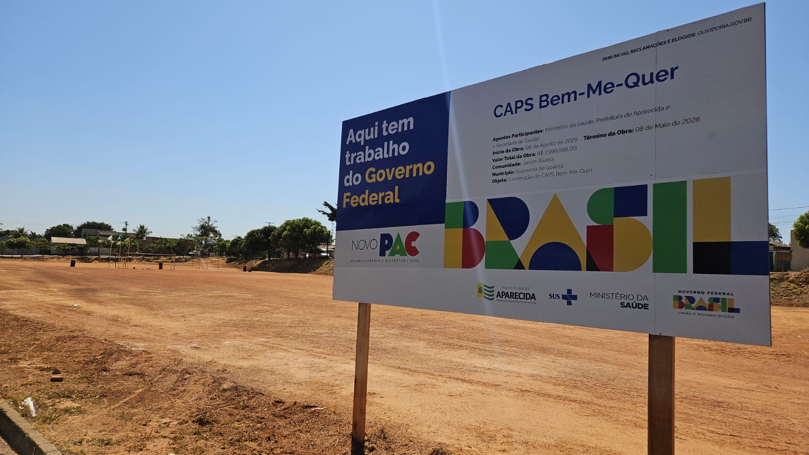 Placa fixada no local da construção prevê que o CAPS será entregue em maio de 2026.