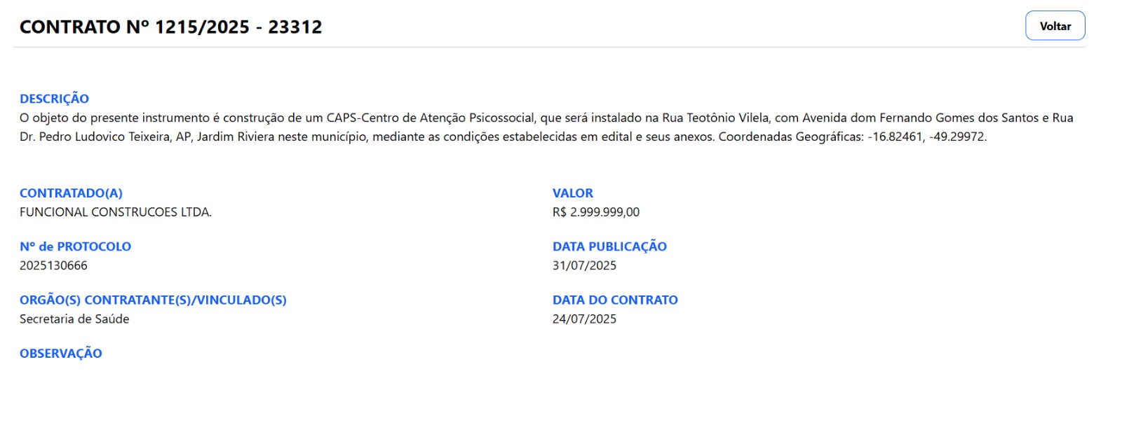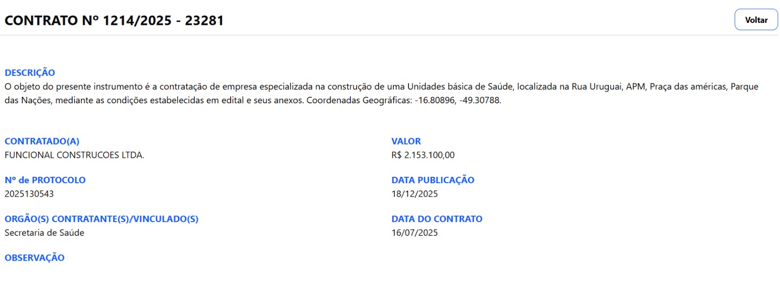 O prazo para conclusão da obra é de 12 meses. O contrato foi publicado no Portal da Transparência no dia 24 de julho.