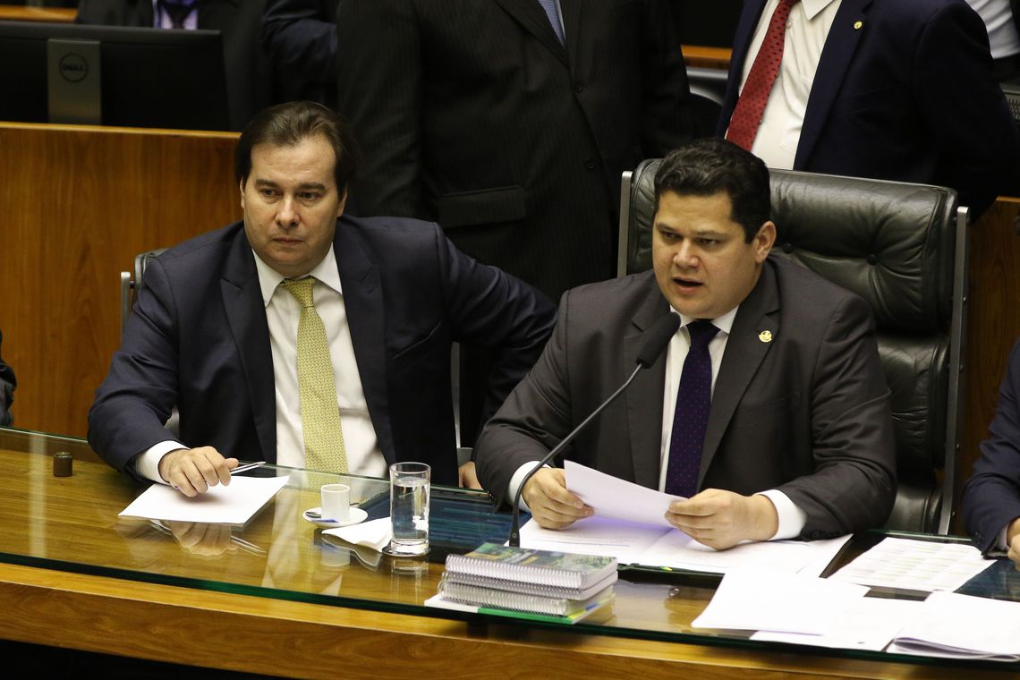 O Presidente do Congresso, Davi Alcolumbre, acompanhado do presidente da Câmara, Rodrigo Maia, preside sessão do Congresso Nacional
