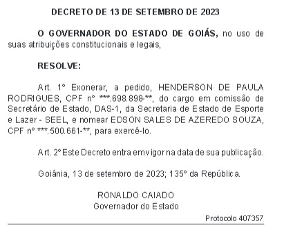 O governador de Goiás, Ronaldo Caiado (União Brasil), mudou a direção da Secretaria de Estado de Esporte e Lazer (SEEL) nesta 4ª feira (13).