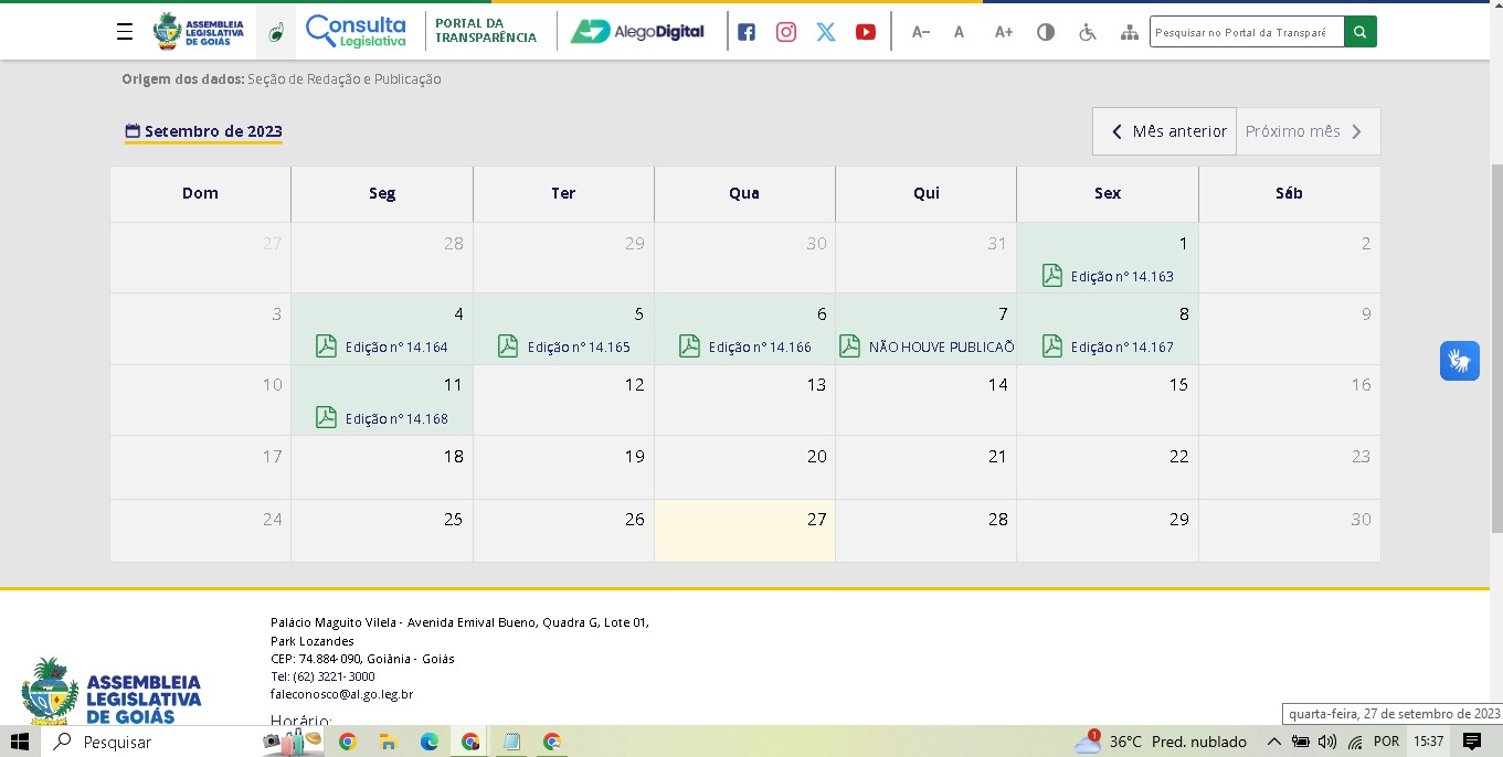 A última publicação do Diário Oficial da Assembleia Legislativa de Goiás (Alego) foi divulgada pelo Portal da Transparência da Casa no dia 11 de setembro.