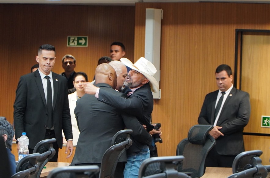 Imagens da transmissão da TV Alego mostram o momento em que o parlamentar foi contido pelos policiais legislativos.