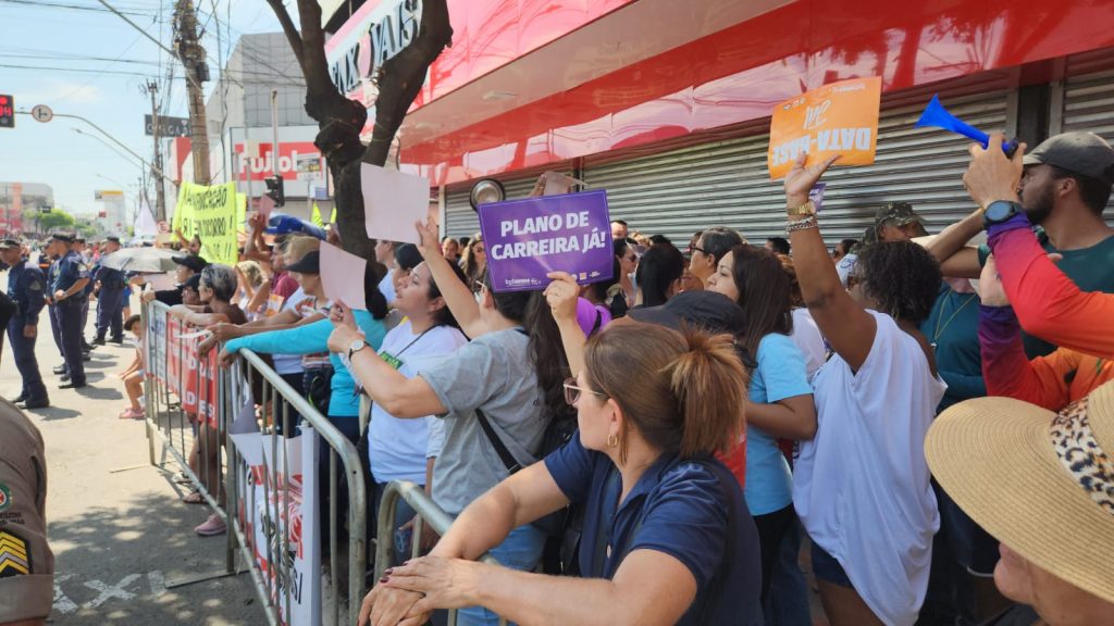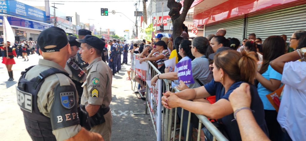 O desfile cívico-militar em comemoração ao aniversário de 90 anos da capital na manhã desta 3ª feira (24), foi marcado por protesto de servidores administrativos da rede municipal de Educação, que reivindicam a elaboração de um novo plano de carreira.