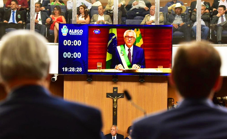 Empossado nesse domingo (1°) para seu 2º mandato, o governador Ronaldo Caiado fez longo discurso por meio de transmissão remota reproduzida no plenário Iris Rezende, na Assembleia Legislativa.