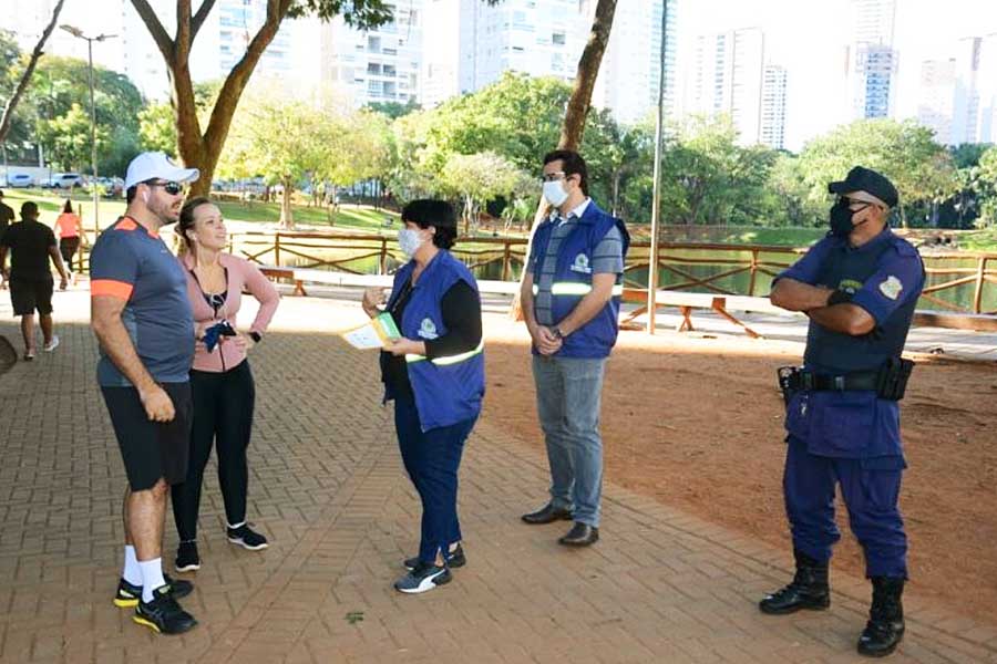 As equipes de fiscalização estiveram no Parque Flamboyant, região sul da capital, e abordaram frequentadores, avisando-os da nova medida obrigatória.