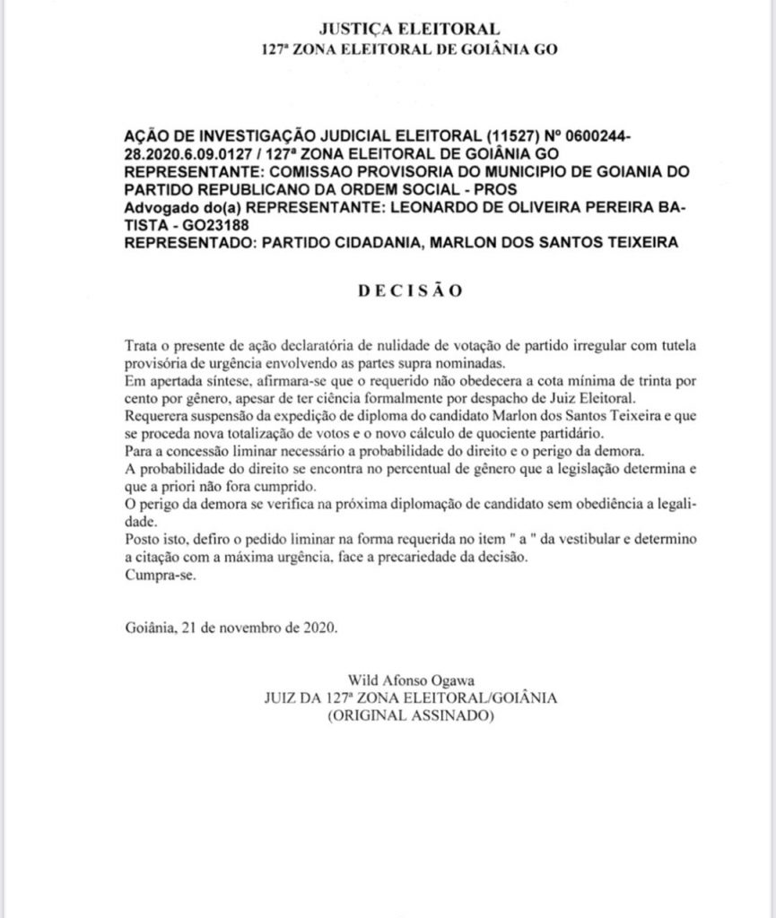 Decisão do juiz da 127 ª zona eleitoral determina a nulidade dos votos do partido Cidadania, pelo fato de a legenda não ter cumprido com a cota mínima de 30% por gênero.