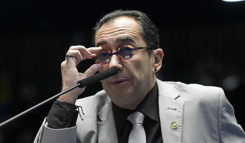 O senador goiano Jorge Kajuru (PSB) usa uma caneta e óculos de espião dentro do Congresso Federal.