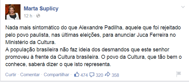 “Nada mais sintomático do que Alexandre Padilha, aquele que foi rejeitado pelo povo paulista, nas últimas eleições, para anunciar Juca Ferreira no Ministério da Cultura. A população brasileira não faz ideia dos desmandos que este senhor promoveu à frente da Cultura brasileira. O povo da Cultura, que tão bem o conhece, saberá dizer o que isto representa”, escreveu Marta no Facebook.