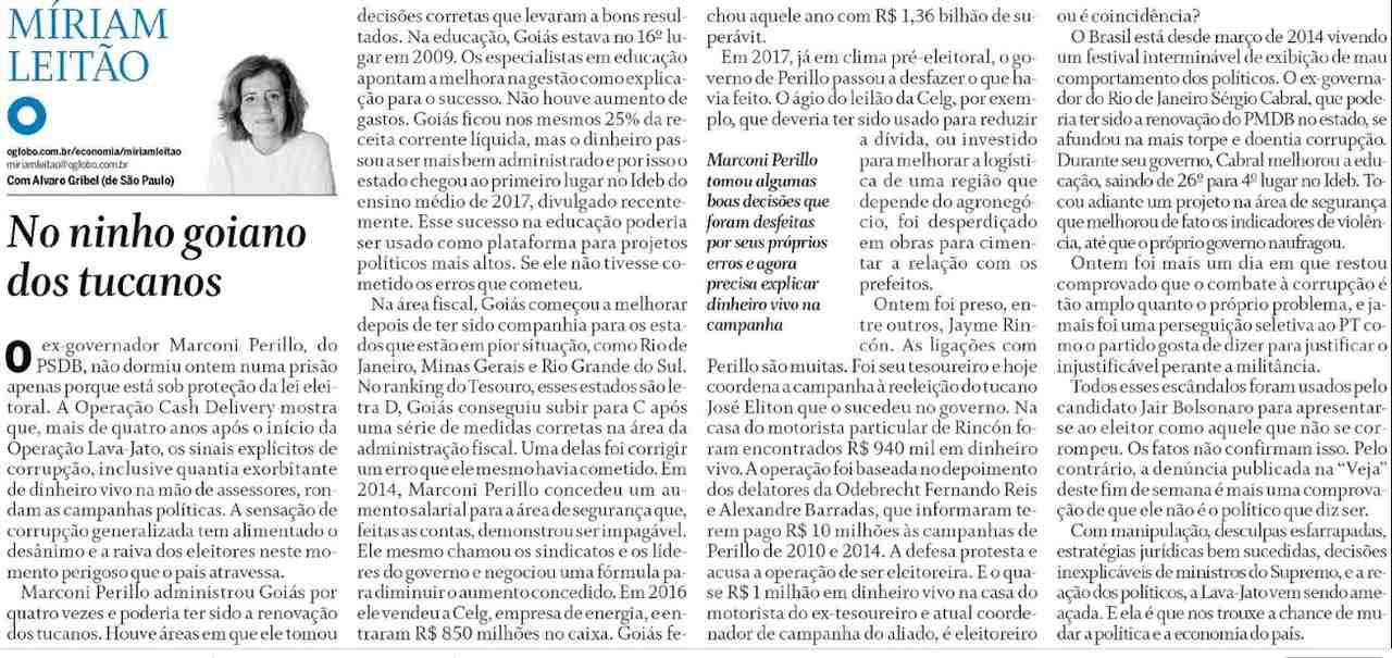 Em artigo para o jornal “O Globo”, a jornalista Míriam Leitão teceu duras críticas ao ex-governador de Goiás Marconi Perillo (PSDB).
