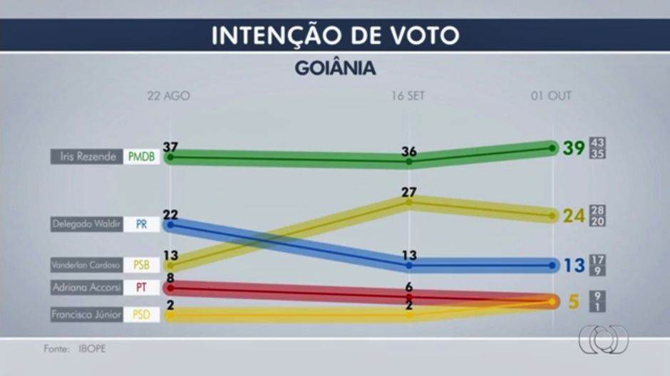Pesquisa divulgada na noite deste sábado (1º) mostra o candidato do PMDB, Iris Rezende, na frente com 39% das intenções de voto. Vanderlan Cardoso, do PSB, aparece com 24%. O levantamento aponta crescimento de Delegado Waldir (PR), que agora aparece com 13%. Já Adriana Accorsi (PT) sofreu leve queda e teve 5% das intenções de voto. Francisco Júnior (PSD) também cresceu e tem 5%.