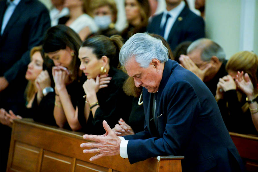 O governador assistiu à missa ao lado da 1ª dama, Gracinha Caiado, da ex-esposa Thelma Gomes e das filhas Maria, Marcela e Anna Vitória.