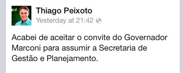 O deputado federal eleito, Thiago Peixoto (PSD), anunciou pelo Facebook que será o novo secretário da Secretaria de Gestão e Planejamento (Segplan).