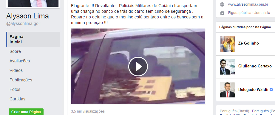 Na legenda, o vereador escreveu: “Flagrante! Revoltante. Policiais Militares de Goiânia transportam uma criança no banco de trás do carro sem cinto de segurança. Repare no detalhe que o menino está sentado entre os bancos sem a mínima proteção”.