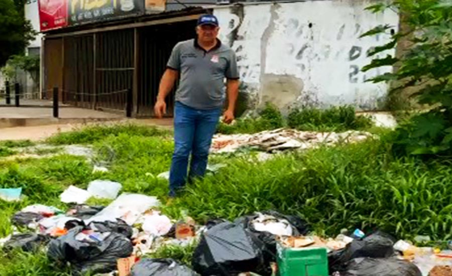 Gilsão aparece em frente a um amontado de resíduos que, segundo ele, estão depositados sem coleta há dias.