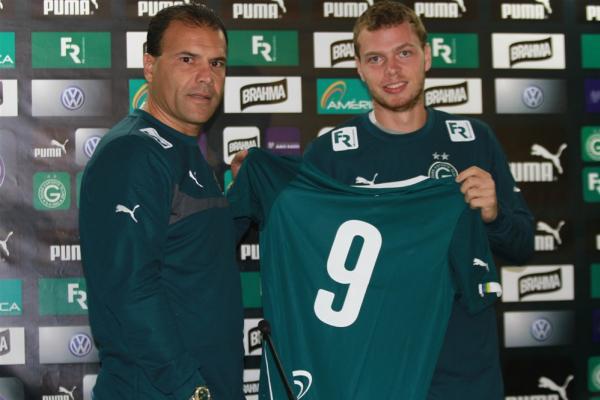 Lucas Coelho é apresentado e recebe a camisa do goiás das mãos do diretor Harlei de Menezes (Foto: Site Goiás Esporte Clube)