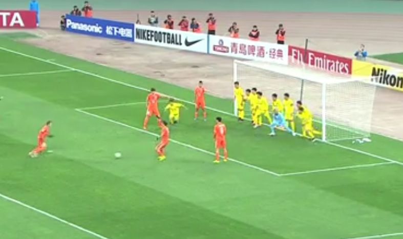 A bola passou por cima e marcou um dos quatro gols dos chineses, que empatou de 4 a 4 na Liga dos Campeões da Ásia, nesta quarta-feira (8), no Estádio da Província de Shandong, na China.