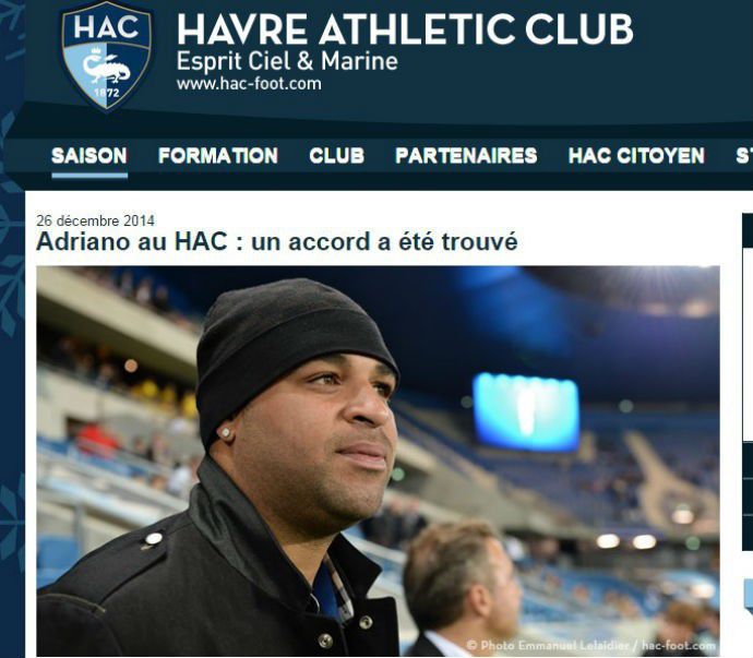 Confirmado! O atacante Adriano vai mesmo para o Le Havre, da Segunda Divisão da França. O clube confirmou em seu site oficial nesta sexta-feira, 26.