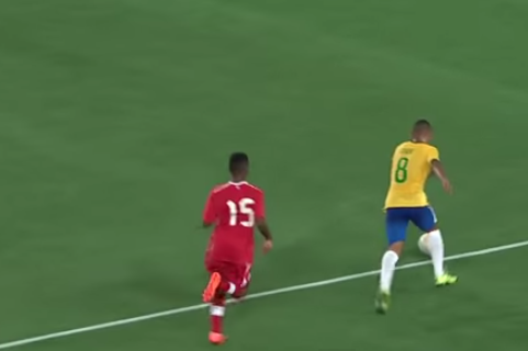 No segundo tempo, o atacante Érik, do Goiás, entrou no jogo e aos 43 minutos marcou, de cabeça, o quarto gol do Brasil na partida.