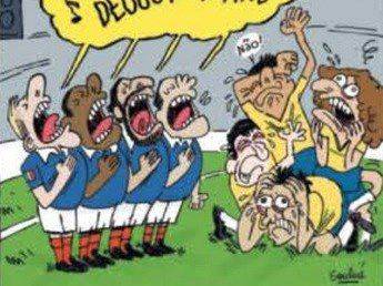 O jornal francês “L’Equipe” publicou na sua edição desta quinta-feira, 26, uma charge que durante a execução do hino nacional, os jogadores franceses entoam o nome da “Alemanha”. O Brasil enfrenta a França em amistoso ainda hoje no Stade de France, na cidade de Saint-Denis.