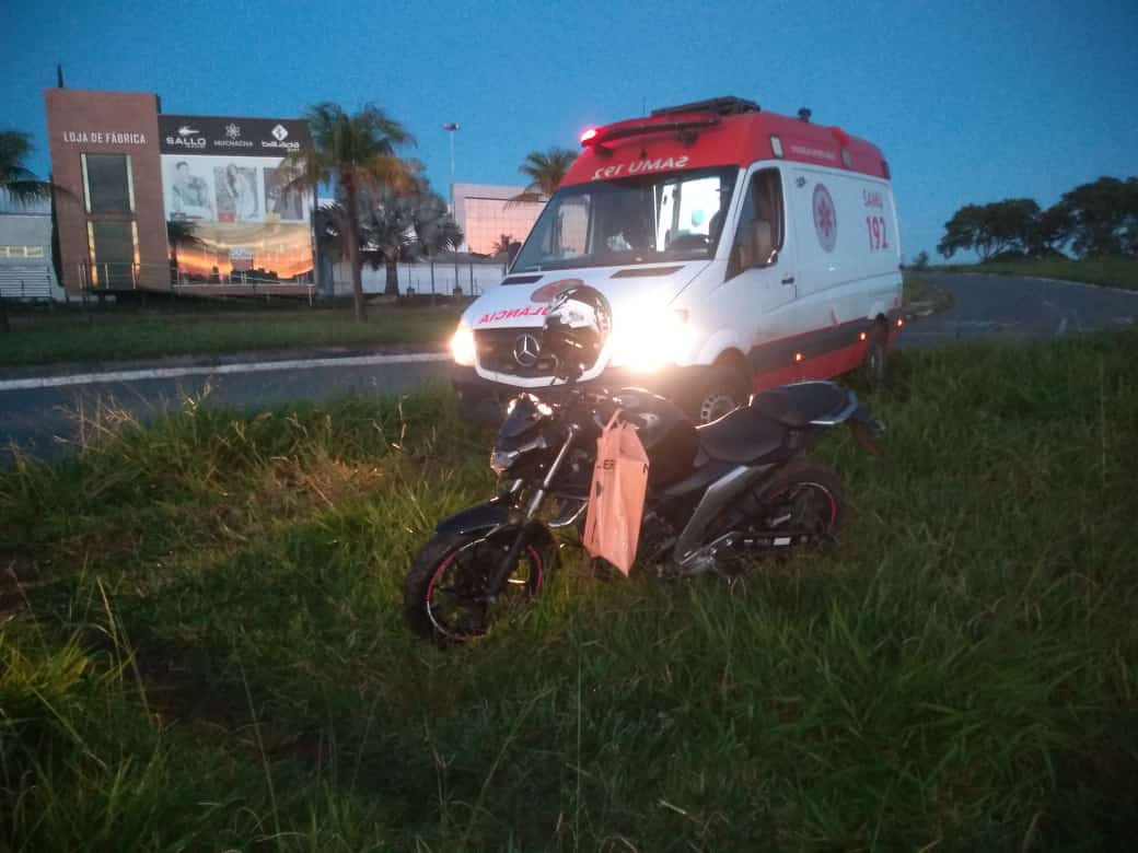A condutora disse aos socorristas que estava em um evento e ao passar pelo Eixo Primário não viu a rotatória, perdeu o controle da motocicleta e sofreu a queda.