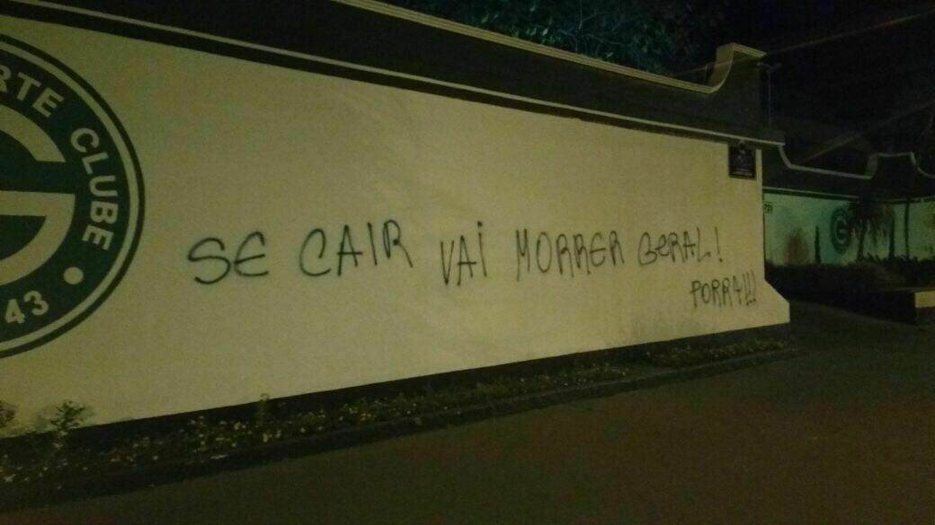 “Se cair, vai morrer geral”, lia a pichação, apagada nas primeiras horas da manhã pela administração do clube. A mensagem, com claro teor de ameaça, faz referência ao baixo aproveitamento do time no campeonato e à possibilidade de rebaixamento para a Terceira Divisão.