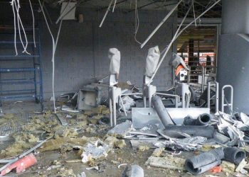 A carroceria, onde as vitimas estavam, ficou parcialmente destruído, demonstrando a proporção da explosão. O veículo passa por perícias para ...