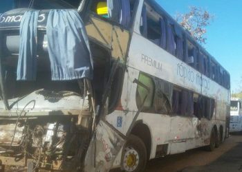 O ônibus, após colidir com o veículo, tombou e obstruiu uma das pistas da rodovia | Foto: PRF Duas pessoas ...