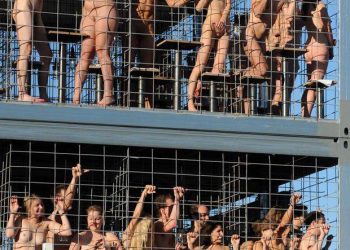Um grupo de homens e mulheres posou nu dentro de gaiolas no sábado (14) durante o festival de inverno Tollwood, ...